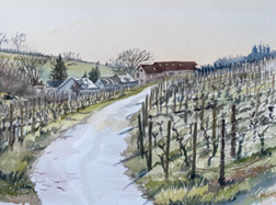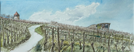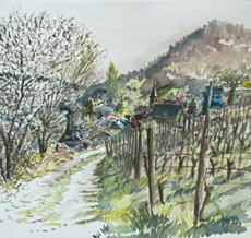 À la mi-mars, les journées sont devenues sensiblement plus longues et plus douces. Les voix des personnes profitant de la terrasse du domaine me parviennent tandis que je peins cette vue dans la direction opposée. Le soleil se couche maintenant lentement derrière le Markusberg, mais il a accompli son œuvre ces derniers jours, faisant éclore des fleurs blanches sur des branches jusque-là nues le long des vignobles et apportant des touches de rose et de jaune aux jardins du village. Le printemps est désormais véritablement installé, tandis que la vie revient dans le paysage.