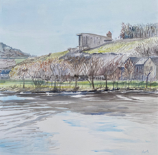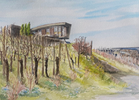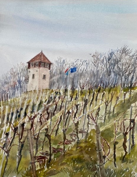 Nous sommes à la mi-février, et les vignes sont encore nues sous un ciel de printemps qui continue d’apporter des averses de neige et de pluie mêlées. Par ce temps frais et imprévisible, je suis reconnaissante de pouvoir peindre à l’intérieur, dans le confort du Wäistuff, où l’énorme façade du spectaculaire bâtiment Valentiny s’ouvre sur un panorama de vignobles s’étendant jusqu’à l’horizon forestier. De l’autre côté de la Moselle se trouve la terre allemande, offrant ainsi une vue qui traverse les frontières. En effet, le sentiment de non-frontière est au cœur de l’identité de Schengen, le village qui a donné son nom à l’espace Schengen.