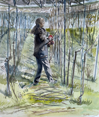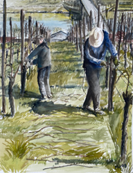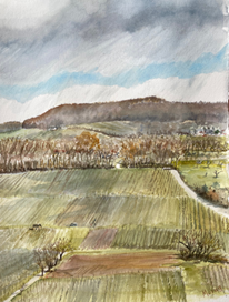 Il s’agissait de la toute première peinture créée pour la série Domaine et Terroir, au début du mois de février. Les arbres le long de la crête étaient encore dépourvus de feuilles, et les corbeaux croassaient avec force à travers la brume qui flottait entre eux. Je m’étais habillée chaudement, gants compris, travaillant par seulement trois degrés au-dessus de zéro. Pourtant, la terre savait déjà que le sommeil de l’hiver touchait à sa fin. Un parfum de terre humide s’élevait du doux tapis vert jaunâtre recouvrant les pentes. Ici et là, les restes de branches taillées jonchaient le sol. La nature semblait en attente—comme suspendue—et pourtant, subtilement, presque imperceptiblement, elle s’éveillait.